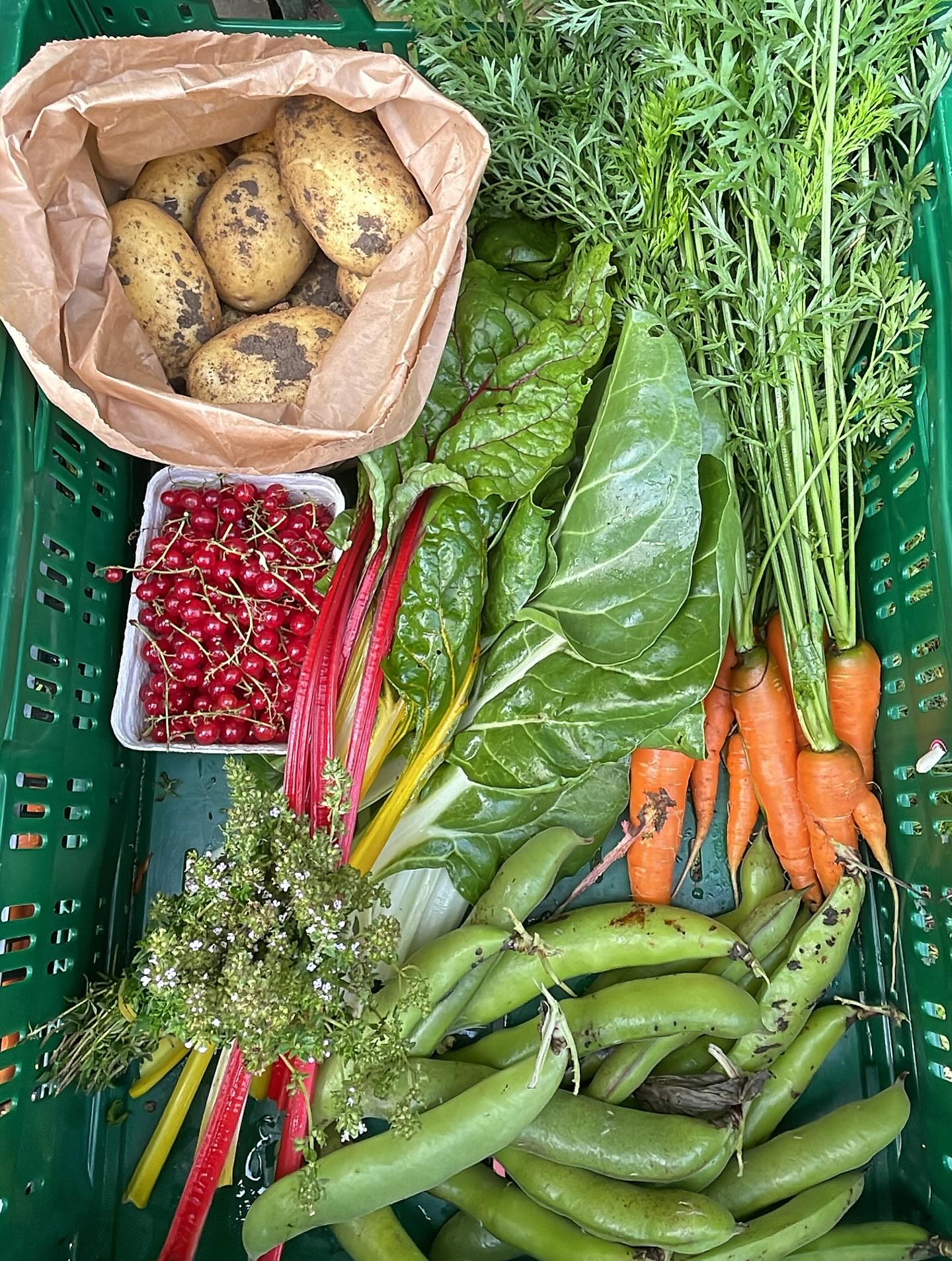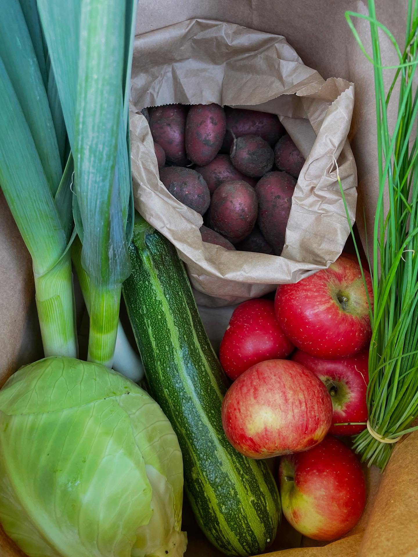Størstedelen af indholdet består af grøntsager og urter, men i sæsonen vil der også være jordbær og æbler fra gården.